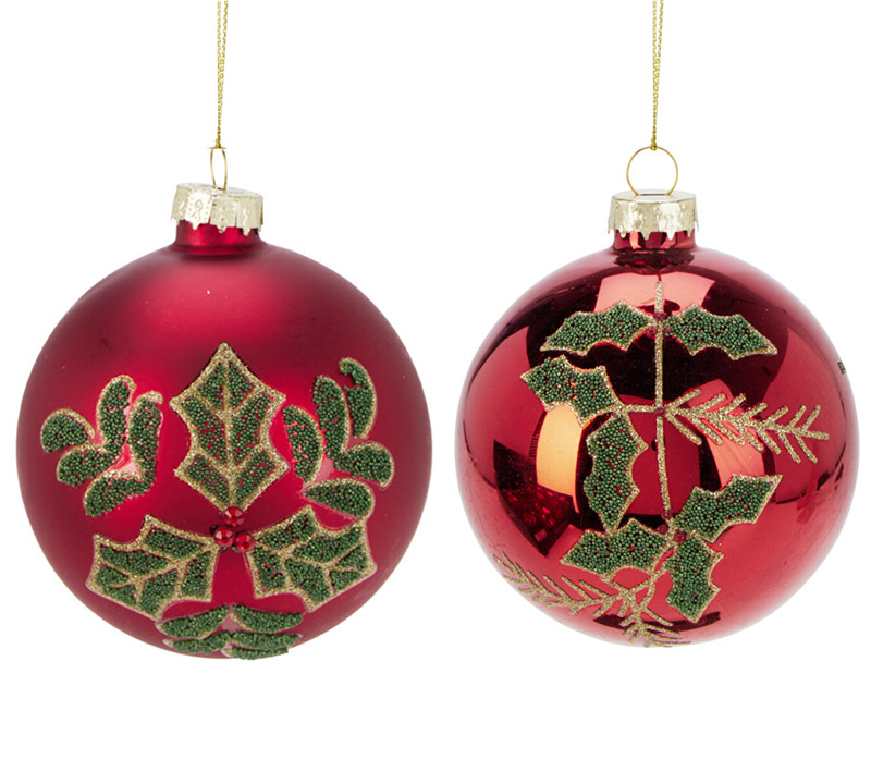 Γυάλινη μπάλλα κόκκινη με φύλλα γκυ 8cm