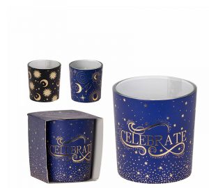 Αρωμ.κερί σε γυαλί 7×7,5cm, μπλε/χρυσό ντεκορ.